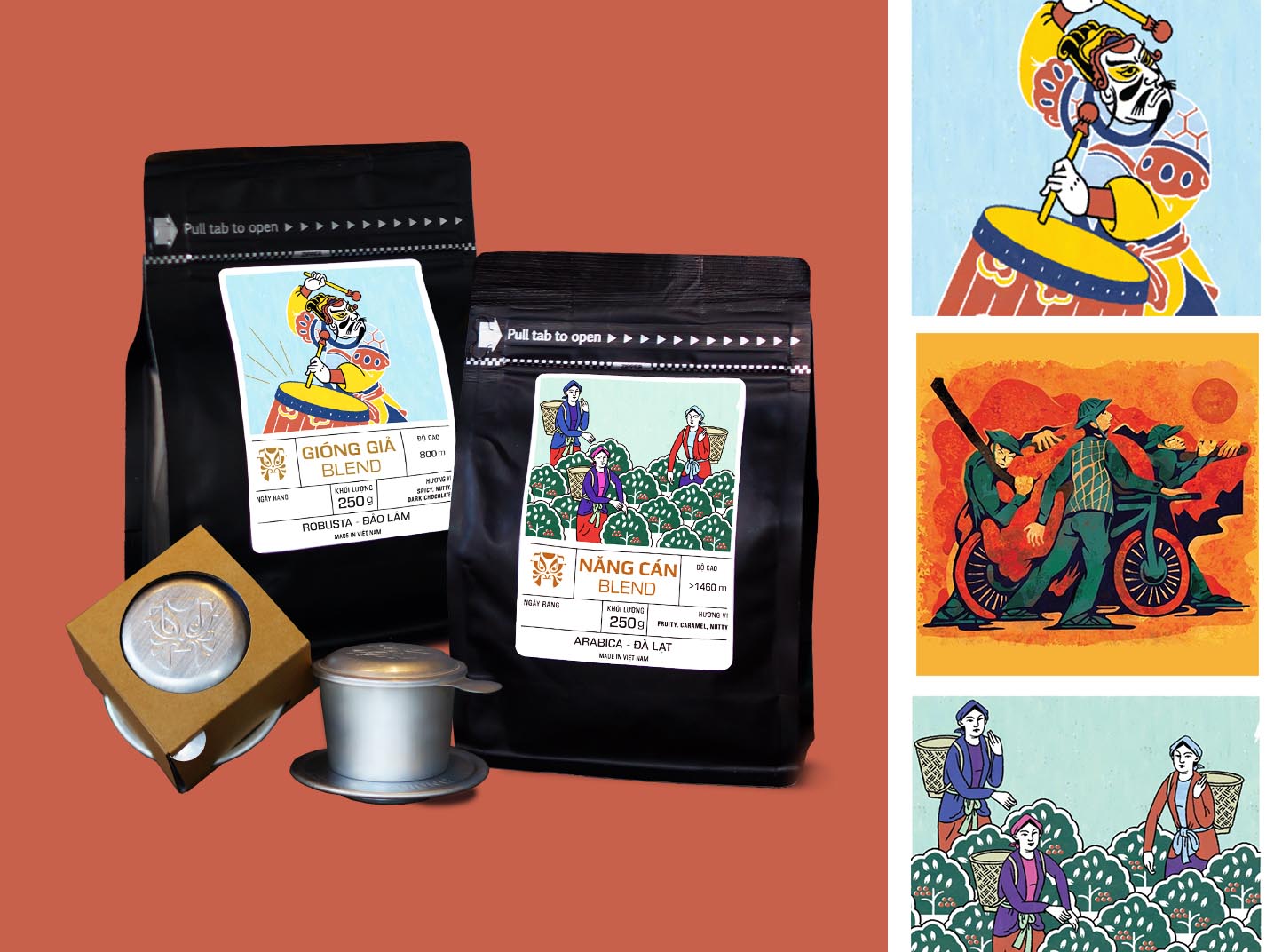 Giong Cafe is distinguished by its unique packaging, which features artistic illustrations inspired by Vietnamese traditional artwork. Three varieties of single-origin coffee and seven varieties of blended coffee, all with names and packaging inspired by aspects of Vietnamese culture, are offered by Giong Cafe. This high-quality Vietnamese coffee is sourced from local beans that are not well-known for their quality throughout the world, but the brand takes pride in introducing Vietnamese quality through its products to everyone.