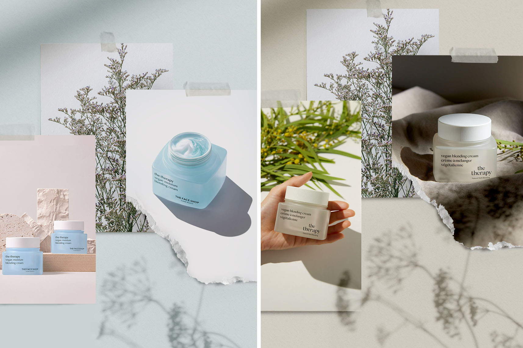 In line with the new brand positioning, The Face Shop introduced sustainable packaging for The Therapy Vegan Line, a range of eco-friendly, vegan skincare products that do not contain any animal-derived ingredients and are not tested on animals. The packaging features biodegradable materials, refill systems, and a focus on reducing plastic waste, aligning with the brand's commitment to clean beauty and environmental responsibility. The packaging underwent a complete redesign, adopting a modern and minimalistic look, and includes the use of sustainable kraft paper boxes and a refill system. Instead of buying a new jar of cream, consumers can opt for a pod that can be placed into the existing container, reducing reliance on plastic.
